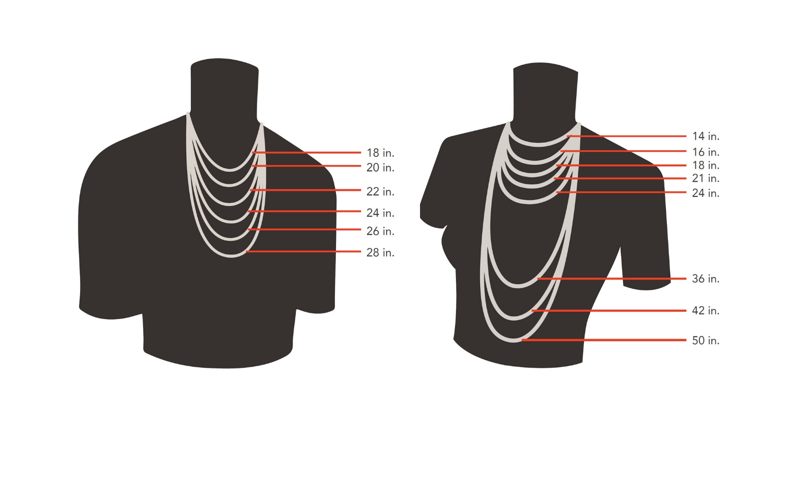 Using a flexible tailor’s tape, measure the necklace from clasp to clasp to determine the length. Below, you will find an illustrated chart of how the necklace may appear while worn.